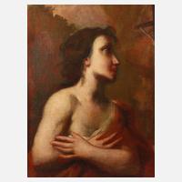 Brustbildnis der spärlich bekleideten Begleiterin Jesu, als Büßerin vorm Kreuz, gering pastose religiöse Genremalerei des Barock, Öl über rotem Bolus auf Leinwand, 18. Jh., unsigniert, Craquelure, wohl Fragment, auf Sperrholzplatte aufgezogen, restauriert, ungerahmt, Maße ca. 60 x 56,5 cm.
