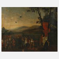 sommerliche Gebirgslandschaft, mit König und seinem Gefolge, bei der Andacht vorm Feldaltar, detailreiche, vielfigürliche Malerei, Öl auf Leinwand, 17. Jh., unsigniert, unter der Darstellung wohl Freiherrenwappen derer von Nesselrode, über der Darstellung kreisen zwei Adler, je mit teils unleserlichen lateinischen Spruchbändern "His Delium" und "Sic. Volo", Craquelure, Farbplatzer, originale waagerechte Ansatznaht, hinterlegte Fehlstellen, alt restauriert, etwas restaurierungsbedürftig, Provenienz: süddeutscher Adelsbesitz, alt gerahmt, Falzmaße ca. 106 x 131,5 cm.
