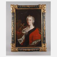 Darstellung der Fürstin aus dem Hause Habsburg (1717-1780), Erzherzogin von Österreich und Königin von Ungarn und Böhmen, im herrschaftlichen Hermelinmantel, die machtbewusste Tochter und Universalerbin Kaiser Karl VI. trat nach dessen Tod 1740 als Thronfolgerin seine Nachfolge als Erzherzogin von Österreich an - allein die Übernahme der Kaiserwürde durch Maria Theresia war den Konventionen der Zeit geschuldet unmöglich, so erreichte Maria Theresia, dass ihr Gatte Franz I. Stephan von Lothringen 1745 offiziell zum Kaiser gewählt ward, obgleich Maria Theresia auch die kaiserlichen Regierungsgeschäfte voll in ihrer Hand hielt, so konnte sich Maria Theresia nicht mit den kaiserlichen Insignien der Macht - Kaiserkrone und Reichsapfel - direkt darstellen lassen - sie ruhen auf ihrem Portrait auf einem rotsamtenen Kissen zu ihrer Rechten, gering pastose barocke Bildnismalerei, Öl auf Leinwand, 18. Jh., unsigniert, ehemals hochoval gerahmt, auf Sperrholzplatte aufgezogen, restauriert, verzogen, etwas restaurierungsbedürftig, im alten barocken Rahmen (best.), Falzmaße ca. 84 x 59 cm.