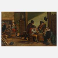 rauchende, trinkende und Karten spielende Männerrunde im Interieur, gering pastose Malerei in der Tradition der alten Niederländer, Öl auf Holzplatte, wohl 18. Jh., unsigniert, Malgrund verzogen, alte Retuschen, ungerahmt, Maße ca. 35 x 53,5 cm.