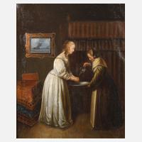 herrschaftliches Interieur mit Dienstmädchen, einer jungen Dame beim Hände waschen assistierend, fein lasierende Kopie nach dem um 1655 entstandenen Gemälde der Dresdner Gemäldegalerie Alte Meister "Eine Dame, die sich die Hände wäscht" von Gerard ter Borch (1617 Zwolle bis 1681 Deventer), Öl auf Leinwand, wohl 18. Jh., unsigniert, rückseitig altes fragmentarisches Kunsthandlungsetikett mit undeutlichen Annotationen, Craquelure, stärker restauriert, restaurierungsbedürftig, in alter Goldstuckleiste gerahmt, Falzmaße 67,5 x 56 cm.