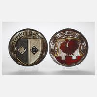 19. Jh., monogrammiert, Wappen Heinrich Toppler 1340-1408 und Wappen 1588-1668 Georg Nusch, beide aus Rothenburg ob der Tauber, in Blei gefasste Scheiben mit fein gemalter Wappendarstellung, partiell rot überfangen, mit Wandaufhängung, guter Zustand, D je 15 cm.