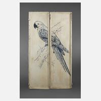 Italien, 18./19.Jh., Massivholz rot gebeizt, später weiß lackiert, einseitig kassettiert, mit originalem Schloss und zwei Riegeln, später mit gemaltem Papageiendekor verziert, Altersspuren, Maße je Türflügel 181 x 53 cm.