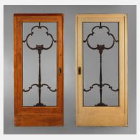 um 1915, aus massivem Nadelholz, Beschläge aus Messing, Türfüllungen beidseitig mit floral geschnitzten Zierelementen (eins fehlt), ohne Verglasung, ein Türblatt beigefarben lackiert, das andere naturbelassen, originaler Messingbeschlag und Originalschloss, mit Hakenverriegelung, Maße 224 x 99 x 6 cm.