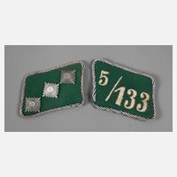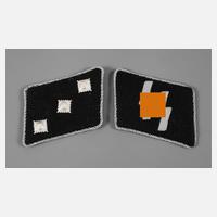 für einen Untersturmführer, schwarzes Tuch über Leinen und silberner Paspelierung, linker Spiegel mit zwei Runen bestickt, rechter Spiegel mit drei Sternen aus Alu bestückt, mit Typenschild auf der Rückseite, in originaler Verkaufstüte der Firma Josef Andrysek, Uniformen – Militäreffekten, Wien, IV/ 50, Favoritenstraße Nr. 29, Ruf U 48-5-97, guter Zustand.