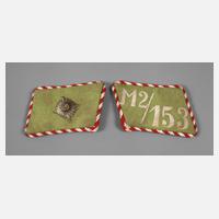 für einen Standartenführer, schwarzer Samt auf Leinen mit silberner Paspelierung, auf jeden ein sauber gesticktes Eichenlaubblatt, mit Typenschild auf der Rückseite, in originaler Verkaufstüte der Firma Josef Andrysek, Uniformen-Militäreffekten, Wien IV/50, Favoritenstraße Nr. 29, Ruf U 48-5-97, sehr guter Zustand.