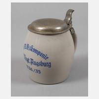 Steinzeug 0,5 L, bezeichnet "4. M.G. Kompanie Inf. Regt. Augsburg 1934/35", Zinndeckel mit Namensangabe P. Müller und HK graviert, Hersteller Emil Sahm Grenzhausen, guter Zustand, H max. 14 cm.