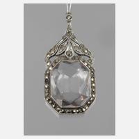 um 1920, Silber gestempelt 835, geometrische Form, besetzt mit einem hellen Amethyst, umgeben von facettierten Markasiten (drei Steine fehlen), L ca. 47 mm, an 50 cm langer Kette, G gesamt ca. 8,7 g.