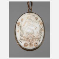 um 1917, Porzellan und Messing, Porzellanplatte bemalt mit einer zwischen zwei Vasen stehenden Frau auf einer Konsole, rückseitig Blumenmarke L.J. und WW, Malerei berieben, Maße Porzellanplatte 41 x 33 mm.