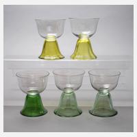 wohl Wien, um 1900, optisch geblasener Fuß, zwei verschiedene Grüntöne, glockenförmige Kuppen aus farblosem Glas, fünf Stück, H je ca. 10,5 cm.