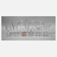 Ausführung um 1930, farbloses und lachsfarbenes Glas, formgepresst, ovale und runde Gefäßformen mit Bodenstern und Schälschliffoptik, zwei Vasen, zwei Fußvasen, zwölf Kännchen, zwei Deckeldosen (ein Deckel fehlt) sowie Essig- und Ölflasche, geringe Gebrauchs- und Altersspuren, H max. 23 cm. Info: Ausgestellt in Paris 1937 und im Österreichischen Museum für Kunst und Industrie 1932/33.