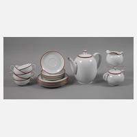 für fünf Personen, Entwurf Hermann Gretsch 1931, grüne Stempelmarken 1930-1947, tlw. geprägte Modellnummer 1382 und weitere Nummern, bauchige Form mit Ohrenhenkeln und roten Randlinien, bestehend aus Kernstück und fünf Gedecken, guter Zustand, H Kanne 20,5 cm, H Tassen gesamt je 5,5 cm, D Teller je 18,5 cm.
