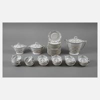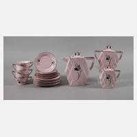 für fünf Personen, Porzellanmanufaktur August Nowotny Altrohlau, tlw. grüne Stempelmarken 1922-1945, vereinzelt Ritz- und Stempelnummern, roséfarbener Scherben, kubistische Form mit rechteckigem Querschnitt, geometrischem Reliefdekor, beidseitigem Blumendekor in Grau-Schwarz, Silberstaffage und Silberrand, bestehend aus Kernstück und fünf Gedecken sowie einem weiteren Teller, eine Untertasse mit Glasurspinne am Boden, sonst guter Zustand mit minimalsten Gebrauchsspuren, H Kanne 22 cm, H Tasse gesamt je 5,5 cm, Maße Teller 17 x 17 cm.
