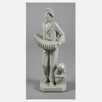 Porzellanmanufaktur in Pirkenhammer, Entwurf L. Kühnlenz um 1925, signiert, grüne Stempelmarke 1918-1938, ein dicker Schleifstrich, naturalistische Ausformung in seladongrünem, farblos glasiertem Porzellan, auf oktogonaler Plinthe stehend junger Bandoneonspieler mit bettelndem Affen zu seinen Füßen, seltene Figur, ein kleiner Brandriss vorm Affen, sonst guter Zustand, H 22 cm.