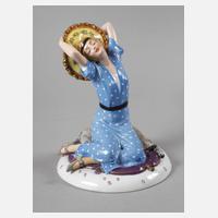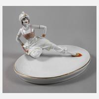 Entwurf Constantin Holzer-Defanti um 1924, signiert, grüne Stempelmarke 1918-1926, gepinselte Dekornummer 24/965 45, naturalistische Ausformung mit eleganter polychromer Aufglasurbemalung und dezenter Goldstaffage, rückseitig auf leicht gewölbter Ovalschale kniende junge Frau mit einem seitlich ausgestreckten Bein und orientalischem Kostüm, Darstellung der deutschen Tänzerin und Schauspielerin Anita Berber (1899-1928) in dynamischer Pose, seltene Figur, Goldrand und Vergoldung des Turbans minimal berieben, sonst guter Zustand, H 17 cm, L Schale 27 cm.