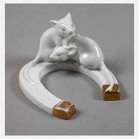 Entwurf Carl Nacke um 1920, grüne Stempelmarke der Kunstabteilung 1915-1926, Ritzbuchstabe M und Pinselnummer 20/98 17, naturalistische Ausformung mit sparsamer Goldstaffage, auf Hufeisen sitzendes Mäusepaar, Vergoldung minimal berieben, H 7 cm.