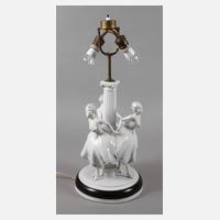 Entwurf Hermann Nonnenmacher/Eigene Werkstatt 1920/21, monogrammiert E.W., grüne Stempelmarke der Kunstabteilung 1919-1926, geprägte Modellnummer 1438 und 9, Pinselnummer 20/343 sowie 19., naturalistische Ausformung in Weißporzellan mit Goldreif, auf profiliertem Rundsockel drei Rücken an Rücken um eine korinthische Säule tanzende Mädchen, hohe säulenartige Montur aus Messing und Blech, zweiflammig elektrifiziert, funktionstüchtig, dazu goldfarbener Schirm, Sockelvergoldung minimal berieben, sonst guter Zustand, H Figur 38 cm, H gesamt 79 cm.