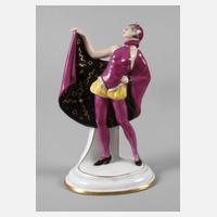 grüne Stempelmarke 1905-1937, geprägte Modellnummer 119., naturalistische Ausformung mit polychromer Aufglasurbemalung und Goldstaffage, auf profiliertem Ovalsockel mit Pfeilerstütze stehende Tänzerin in Kostüm und zurückgeneigter Pose, ihren Umhang seitlich mit einer Hand auf Kopfhöhe anhebend, ein Horn der Kappe bestoßen, sonst guter Zustand, H 19,5 cm.