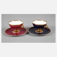 des Passagierdampfers "Bremen" der Reederei Norddeutscher Lloyd Bremen, grüne Stempelmarke 1938-1968, am Boden gestempelte Bezeichnung, Reederei-Logo und diverse Nummern, dünnwandige, halbkugelförmige Tassen mit Scheibenfuß, Ohrenhenkel, kobaltblauem Unterglasur- bzw. roséfarbenem Aufglasurfond sowie partieller Vergoldung und Goldrändern, komplett mit dazugehörigen Untertassen, davon eine minimal haarrissig, sonst guter Zustand, H Tasse je 5,5 cm, D Untertasse je 12,5 cm. Info Schnelldampfer "Bremen": Stapellauf 1929, gewann 1929 erstmals das Blaue Band als schnellstes Schiff auf der Transatlantik-Route Europa-New York, 1941 durch Feuer zerstört, Info: Internet.