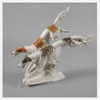 Entwurf Karl Tutter 1933, signiert, grüne Stempelmarke 1970-1985, geprägte Modellnummer 8026, naturalistische Ausformung und Unterglasurbemalung, auf unregelmäßigem Sockel zwei über einen Grasbüschel springende Barsoi, guter Zustand, Klebereste zweier Etiketten entfernbar, H 30,5 cm.