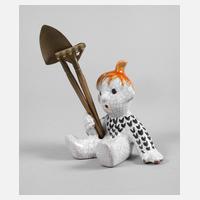 Entwurf um 1958-64, Ausführung Karlsruher Majolika Fabrik bis 1988, ungemarkt, ziegelroter Scherben mit Craqueléglasur, farbigem Pinseldekor und Transparentglasur, sitzender Moritz mit Messingschaufel und Rechen (dieser beschädigt), H 12 cm, mit Geräten 21 cm.