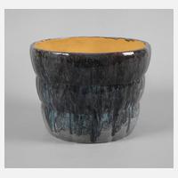um 1915, Ausführung Wienerberger Keramik, geritzte Modellnummer 4104. III., türkisfarbene unleserliche Pinselmarke, ockerfarbener Steinzeugscherben mit verlaufender Glasur in Hellgrau-, Violett-, Türkis- und Blautönen, innen farblose Glasur, die Wandung vertikal und horizontal gerippt, innen Gebrauchsspuren, sonst guter unbeschädigter Zustand, H 19 cm, D 26 cm. Quelle: Ludwig Wilhelm Rochowanski, Wiener Keramik, Leipzig/Wien 1923, S. 70; Kunst-Keramiken (Kat. Verk., Wienerberger Ziegelfabriks- u. Baugesellschaft, Wien), Wien 1926, Nr. 4103.