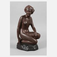neuzeitlich, unsigniert, Stukko mit patinaähnlicher grünbrauner Glasur, auf einem rechteckigen Podest sitzende junge nackte Frau, den Blick verträumt in den Himmel richtend und sich die Haare haltend, geringe Altersspuren, H 54 cm, L 56 cm.