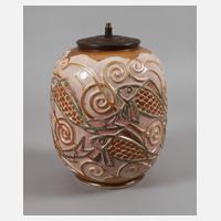 Entwurf Gaston Ventrillon (1897-1982), um 1925, signiert, Herstellermarke und Modellnummer 252.J., geprägtes "L" für das Werk Luneville, Dekornummer 0291, graues Steinzeug pastelltonig bemalt, stilisierte reliefierte Fischmotive mit Voluten und Wellen an Stand und Schulter, Montierung aus patiniertem Messingblech, Elektrik und Schirm fehlen, unbedeutende Oberflächenchips am Stand unten, H 32 cm. Quelle: Pfeiffer, S. 231.