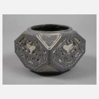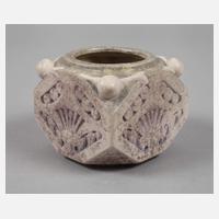 Anfang 20. Jh., reliefierte Signatur und Herstellermarke, Ausführung Mougin Nancy, Modellnummer 1.K, cremefarbenes Feinsteinzeug mit gesprenkelter Mattglasur in Violett und Blau, quadratische Form mit reliefierten und stilisierten Dolden, auf den Schultern vier Weinbergschneckenmotive, runder Stand und Mündung, innen unbedeutend ein Brandriss, leichte Gebrauchsspuren, H 8 cm, D 12 cm. Quelle: Vgl. Jacques Pfeiffer, Les Frères Mougin, Dijon 2001, S. 236.