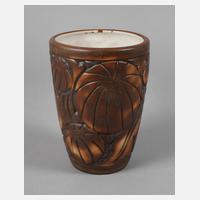 um 1920, Ausführung Mougin Frères Nancy, Prägemarken, Modellnummer 281.J, helles Feinsteinzeug mit brauner Glasur, reliefierter stilisierter Melonendekor, sehr guter unbeschädigter Zustand, H 19 cm. Quelle: www.gres-mougin.fr