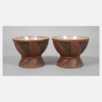 1930er Jahre, Prägemarke, Modellnummer 334.J, reliefierter geometrischer Dekor, innen verlaufende Kristallglasur, pastelltonig und in Kobaltblau, außen Mattglasur in Brauntönen, sehr gute unbeschädigte Erhaltung, H je 14 cm, D 17 cm. Quelle: Vgl. Jacques Pfeiffer, "Les Freres Mougin", Dijon 2001, S. 232.