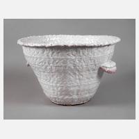 wohl Österreich, um 1930, ungedeutete geometrische Ritzmarke, in Graphit bezeichnet "München St. Georgen, RM 25,–", ziegelroter Scherben, weißlich, leicht transparent glasiert mit rubinroten Effekten, konische Form mit gemuldeten Handhaben, am Mündungsrand etwas haarrissig, innen normale Gebrauchsspuren, H 30 cm, D innen oben 40 cm.