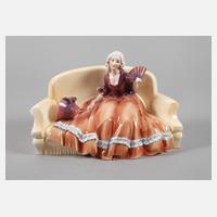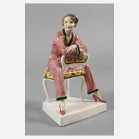 Entwurf Josef Lorenzl um 1928, schwarze Stempelmarke, Schriftzug Made in Austria hand decorated, Modellnummer 5780, Malermonogramm MR2 und ein weiteres Zeichen, Steingut farbig bemalt und farblos glasiert, junge Dame rittlings auf einem Stuhl sitzend, im Sockel signiert, sehr schöner Zustand mit geringem, unbedeutendem Alterscraquelé, H 27 cm. Quelle: Dechant/Goldscheider, Firmengeschichte und Werkverzeichnis, Arnoldsche 2007, S. 415 Nr. 5780.