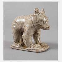 um 1940, Waldkater-Keramik Dessau, Prägemarken, Modellnummer 152, weitere handschriftliche Bezeichnungen, dunkelbrauner Scherben mit weißlicher Transparentglasur, Bärenjunges, auf einem flachen Podest stehend, minimal bestoßen, L 14 cm.