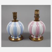 Entwurf Josef Hoffmann 1929, unterglasurblaue Stempelmarken ab 1924, gepinselte Dekornummer 15/6447 und 38, mehrfach gerippte Kugelform mit ausgestelltem Fuß, Rippenbögen alternierend mit hellblauer bzw. roséfarbener Aufglasurstaffage, unterschiedliche Messingmontur, je einflammig elektrifiziert, Elektrik reparaturbedürftig, sonst guter Zustand, H Korpus je 11 cm, H gesamt 17,5 und 18,5 cm.