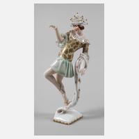 Entwurf Mathilde Jaksch 1927, unterglasurblaue Stempelmarke ab 1924 und roter Zusatzstempel vor 1938, geprägte Modellnummer 1613 und Pinselnummer 69, naturalistische Ausformung mit pastelltoniger Aufglasurbemalung und Goldstaffage, auf Fünfecksockel junge Frau in Kostüm, mit Pagodenhut und Schleier, seltene Figur, eine Sockelecke minimal gechipt, sonst guter Zustand, H 16,5 cm. Info: dynamische Darstellung der österreichischen Tänzerin Tilly Losch (1903-1975) als "Prinzessin Teeblüte" aus Richard Strauß' Ballett "Schlagobers" von 1924, Quelle: Internet.