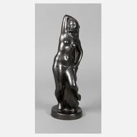 um 1930, unsigniert und ungemarkt, ziegelroter Scherben metallisch schwarz glänzend glasiert, auf runder Plinthe stehende junge Frau als Akt in dynamischer Tanzpose, den Schleier hinter ihrem Kopf herabhängend haltend, Sockelkante mit Chip, sonst guter Zustand, H 40 cm.