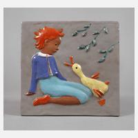 um 1920–25, geprägtes Künstlersignet, Schriftzug Made in Austria und Modellnummer 9026, ziegelroter Scherben mit verlaufender türkisfarbener Glasur, flache runde Schale mit abgekanteter Mündung, innen gemuldet, mit reliefierter stilisierter Blüte, zwei Doppelhenkel mit Rippendekor und Nuppen am Henkelansatz unten, guter altersgemäßer Zustand, D 27 cm.