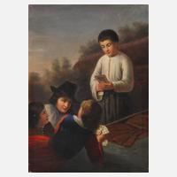 Ende 19. Jh., unsigniert, Prägenummer 313 und Buchstabe M, hochrechteckige Porzellanplatte mit feiner polychromer Aufglasurbemalung, Darstellung von vier kartenspielenden Kindern im Freien, nach einem Gemälde von Gerrit Willemsz Horst (1612 Muiden bis 1652 Amsterdam), in breiter neuzeitlicher Goldleiste gerahmt, rechts oben im Himmel minimal kratzspurig, sonst guter Zustand, Maße Platte 19,5 x 14,5 cm, Maße gesamt 33 x 28 cm.