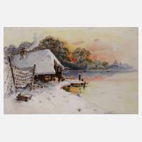 Pressmarke ab 1825, Ritznummer 237-158, Prägezeichen und Jahresbuchstabe (für 1914 oder 1940), querrechteckige Porzellanplatte mit polychromer Malerei, Darstellung einer verschneiten Uferlandschaft mit Fischerkate, Chip am unteren Rand, sonst guter Zustand, Maße 16 x 24 cm.