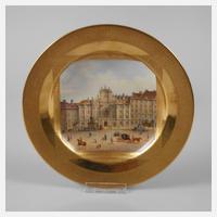 um 1890, ungedeutete unterglasurblaue Herstellermarke Krone mit Schild, gepinselte Schriftzugmarke der Porzellanmalerei Ernst Wahliss sowie Pinselbezeichnung, leicht gemuldeter Teller mit glattem Rand und teils poliertem Goldfond, Mäanderfries der Fahne und Rechteckkartusche mit feiner Reliefgoldmalerei, Spiegelreserve mit Vedute in polychromer Aufglasurbemalung, Ansicht der Kirche am Hof mit Mariensäule und Figurenstaffage, guter altersgemäßer Zustand, D 24,5 cm.