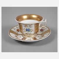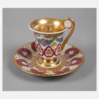 Tasse ungemarkt, Untertasse mit unterglasurblauer Zeptermarke 1837–1844, roter Reichsapfelmarke, Pinselbuchstabe I und Ritzzeichen, Glockenform mit gekehltem Fuß und Frauenkopfhenkel, umlaufend verziert mit einer Blumengirlande, rapportierendem Blumen- sowie Volutenmotiv in feiner polychromer Aufglasurbemalung bzw. radierter Goldmalerei, Goldbänder und Teilvergoldung der Innenwand, dazu passende Untertasse mit facettierter Fahne und ähnlichem Dekor aus alternierendem Floralornament und Efeuranke, Vergoldung partiell berieben, sonst guter Zustand, H gesamt 12 cm.