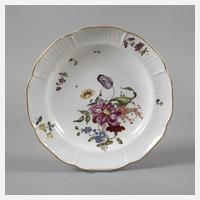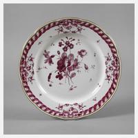 unterglasurblaue CT-Marke 1762–1794, Ritzzeichen B2, geschweifte, leicht gemuldete Form, purpurfarbener Dekor aus umlaufendem Schleifenband mit vier kleinen abgehängten Blumenfestons und einem großem Blumenbukett im Spiegel in feiner Aufglasurbemalung, Goldrand, guter altersgemäßer Zustand mit kleinen Brandfehlern, D 25,5 cm.