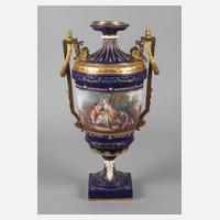 19. Jh., blaue Sévres-Imitationsmarke mit Buchstabe C über liegendem Buchstabe E, dreiteilig montiert, Amphorenform mit ornamentalem Reliefdekor und blau glasiertem Teilfond, reich verziert mit umlaufender bukolischer Landschaftsszene mit galanter Figurengruppe, Schafen und Ziegen in feiner polychromer Aufglasurbemalung, signiert G. Leclerc, sowie Goldmalerei und Emailletupfen, die beiden seitlichen Handhaben in klassizistischer Formsprache aus vergoldetem Messing, Alters- und Gebrauchsspuren, Vergoldung stärker berieben und minimale Emailleverluste, als Lampenfuß mit erneuertem und unvollständigem Innenleben, H 42 cm.