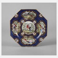 nach englischem Vorbild des 18. Jh., Ausführung Edmé Samson Paris Ende 19. Jh., flach gewölbte, oktogonale Form, reich verziert mit unterglasurblauem Schuppenmosaik, fünf großen und acht kleinen, konzentrisch angeordneten Reserven mit Paradiesvogel- bzw. Insektendarstellung in feiner polychromer Aufglasurbemalung, Rocaillekartuschen in Goldmalerei sowie Goldrand, Wandaufhängung aus Metall abnehmbar, Fahne an einer Ecke restauriert, sonst guter altersgemäßer Zustand, D 23,5 cm. Pendant zu Position 3229.
