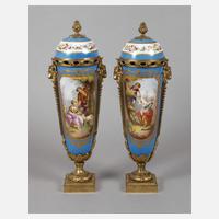im Sèvres-Stil, 19. Jh., ein Deckel mit gepinselter Imitationsmarke, hohe trichterförmige Korpora mit "bleu celeste"-Fond, beidseitiger großer Reserve mit galanter Szene nach Boucher und üppigem Blumenbukett in feiner polychromer Aufglasurbemalung, goldradierter Kartusche, Kuppeldeckel mit korrespondierendem Dekor und mehrteilig verschraubter und vergoldeter Metallmontur, bestehend aus quadratischer Plinthe, Rundfuß, teils durchbrochen gearbeiteten Ornamentfriesen und zwei Handhaben in Form von Widderköpfen sowie Traubenknauf, guter altersgemäßer Zustand, Verschraubung einer Vase erneuert, Goldränder der Deckel minimal berieben, H je 44 cm.