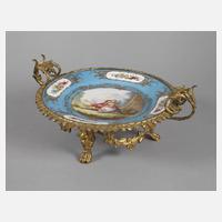 im Sèvres-Stil, 19. Jh., gepinselte Imitationsmarke, signiert Boucher, flacher Teller mit "bleu celeste"-Fond und polychromer Aufglasurbemalung als galante Szene nach Francois Boucher (1703 Paris bis 1770 ebenda) im Spiegel und je einem Blumenbukett in den vier Reserven der Fahne, florale Kartuschen in radierter Goldmalerei sowie mehrteilig verschraubtes und vergoldetes Bronzegestell, bestehend aus drei Tatzenfüßen mit halbplastischem Maskaron, umlaufender Weinranke als Girlande bzw. Bordüre sowie zwei durchbrochen gearbeiteten Volutenhenkeln, Teller etwas kratzspurig und Fahne mit durchgehendem Haarriss in der Kartusche oberhalb der Szene, L 32,5 cm, H 15 cm.