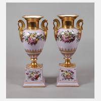 im Empire-Stil, 19. Jh., Ritzbuchstabe D bzw. P und Nummer 8 sowie Pinselnummer 736 und 181, einmal mit undeutlicher französischer Pinselbezeichnung, zweiteilig verschraubt, Amphorenform mit quadratischem Postament, Rundfuß, Trompetenhals und zwei Handhaben in Form eines plastischen Schwans, reich verziert mit üppigen Blumenbuketts in feiner polychromer Aufglasurbemalung und Goldornamenten über fliederfarbenem Fond, teils polierter und matter Vergoldung sowie Goldränder, eine Vasenlippe minimalst brandrissig und Vergoldung kaum sichtbar berieben, sonst guter altersgemäßer Zustand, H je 28 cm.