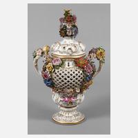 Porzellanmanufaktur Stulz Straßburg, unterglasurblaue Sèvres-Imitationsmarke 1889-1941, auf Rundfuß balusterförmiger Korpus mit gitterartig durchbrochener Wandung, zwei Henkeln und durchbrochen gestaltetem Stülpdeckel, alles reich verziert mit ornamentalem goldstaffierten Reliefdekor, polychromer Blumenmalerei und üppigem, farbig gefasstem Blütenbesatz als schauseitig umlaufende Girlande und bekrönendes Bukett, Besatz alt restauriert, H 37 cm.