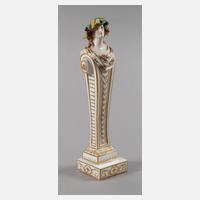 wohl Léon Bourdois & Achille Bloch, um 1900, unterglasurblaue Meissen-Imitationsmarke als Schwerter mit den Buchstaben A und B, auf rechteckigem Sockel hoher Pfeilerschaft mit Büste einer jungen rosenbekränzten Frau mit Tuchdraperie, polychromer Aufglasurbemalung und Goldstaffage, kleine Herstellungsfehler, sonst guter Zustand, H 22 cm, Pendant zu nachfolgender Position.